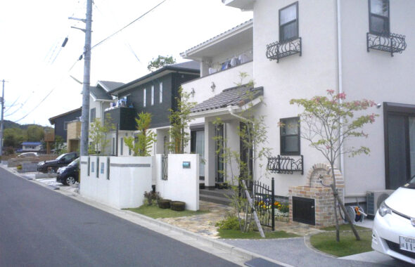 カフェを連想させるパラソルを使ったガーデンリフォーム