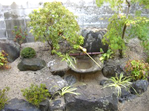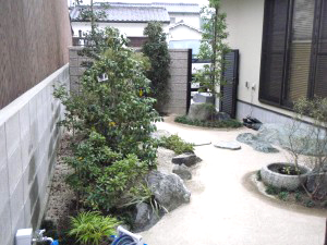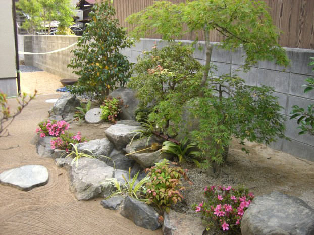 和の庭 つくばいが目を引く和風庭園 つくばいが目を引く和風庭園です。施主様の旧庭にあった自然石を生かした庭に仕上がりました。縁石も旧庭に使ってあったものを再利用しています。アプローチ部分は、真砂土舗装で砂紋仕上げにしています。 和の庭, 庭廻り レンガと洗い出しのステップ 狭いスペースを広く魅せるデザイン