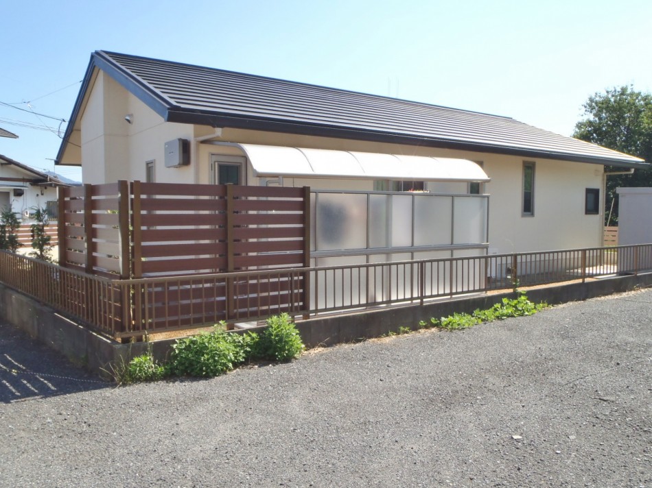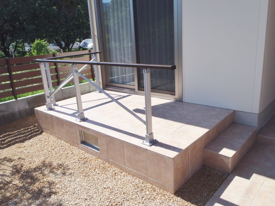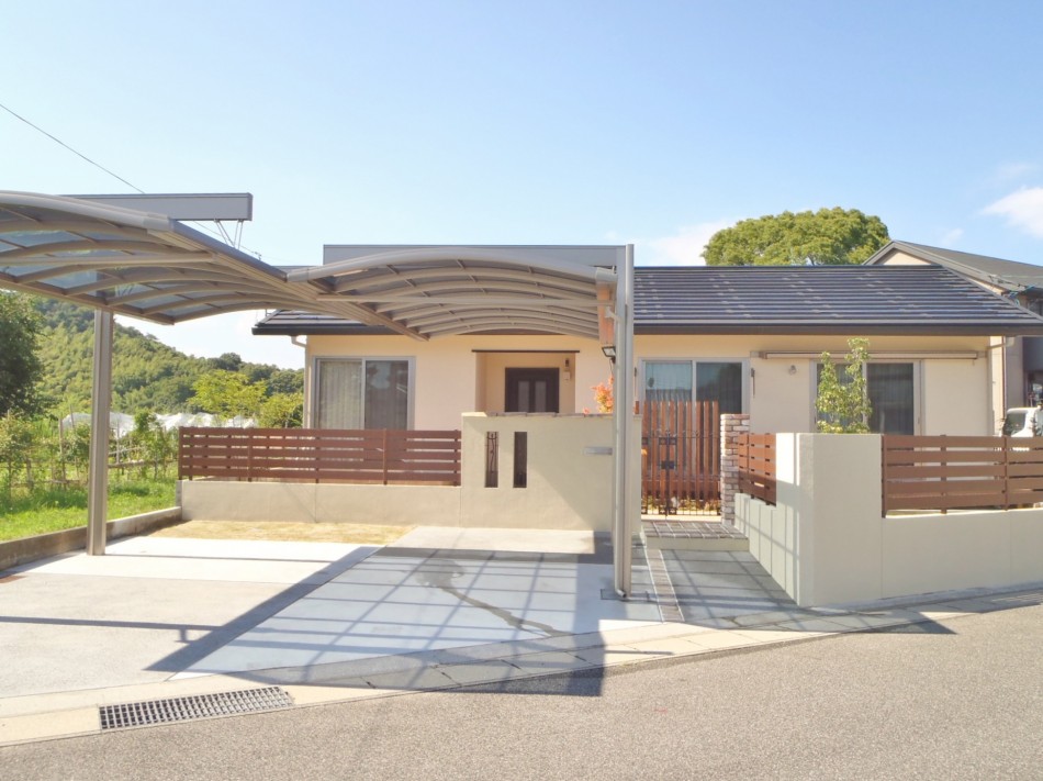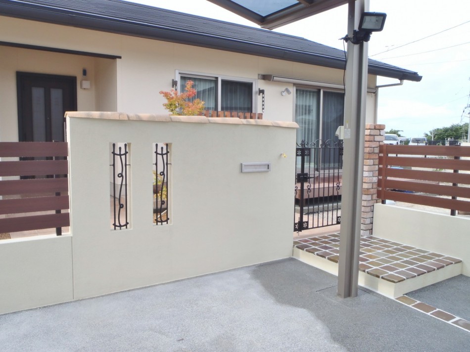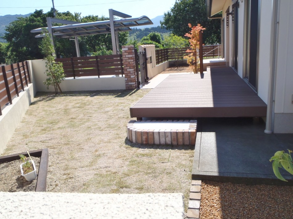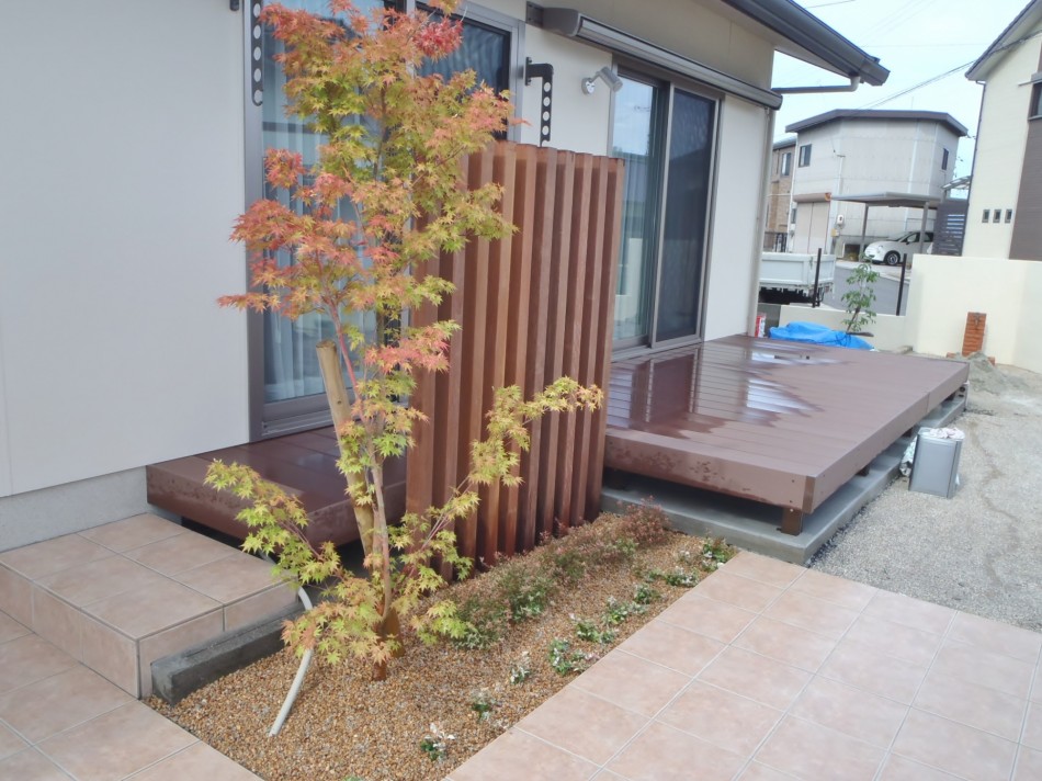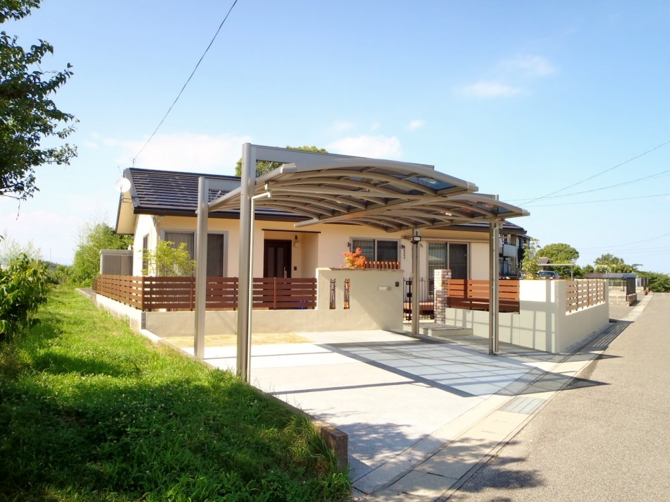 デッキ・テラス リフォームに合わせたリガーデン 洋風のおしゃれな外観にご主人様こだわりのU-スタイルのカーポートが映えます。全体と統一感のあるタイルテラスで、使い勝手も良い仕上がりに。オシャレな目隠しフェンスでプライベートの空間を仕切れます。 デッキ・テラス, トータルデザイン, 目隠し, 車庫廻り, 門廻り 個人邸の庭園管理・剪定 モダン和風の落ち着いたエクステリア