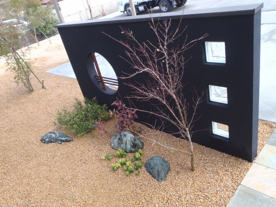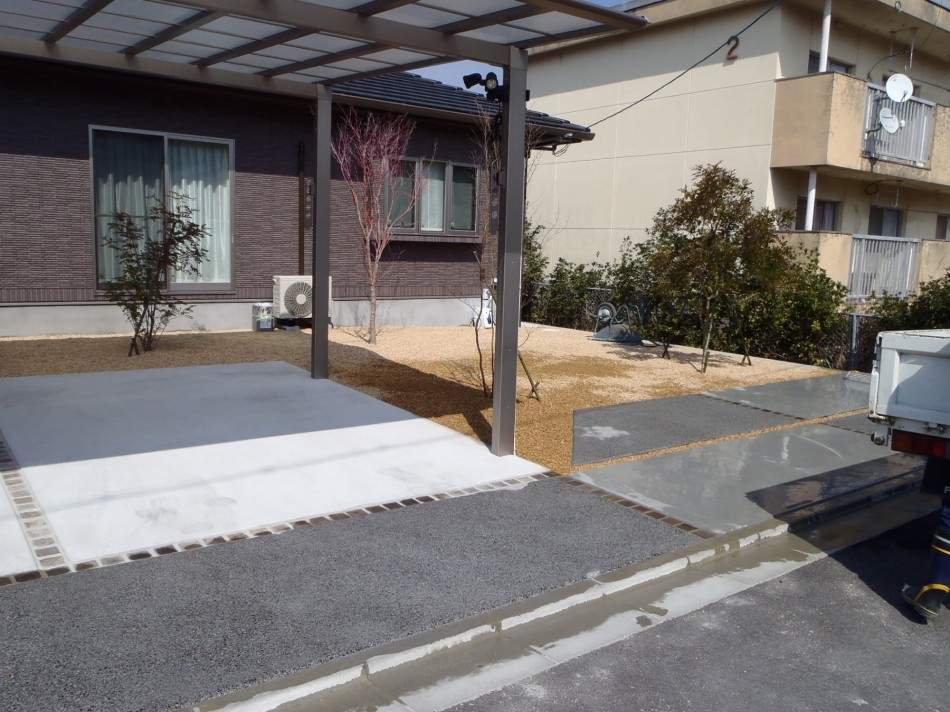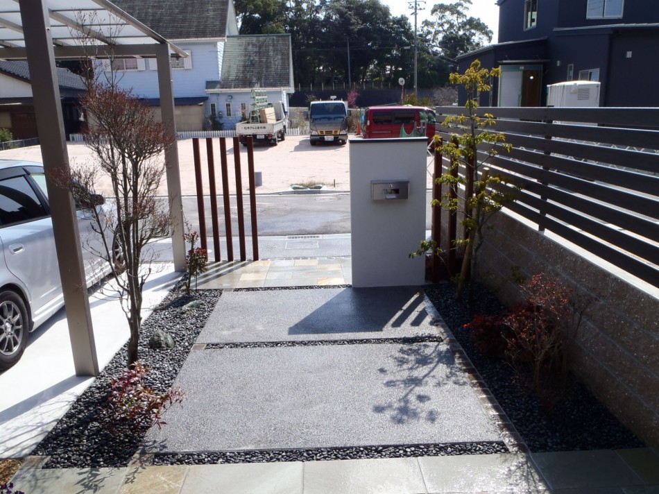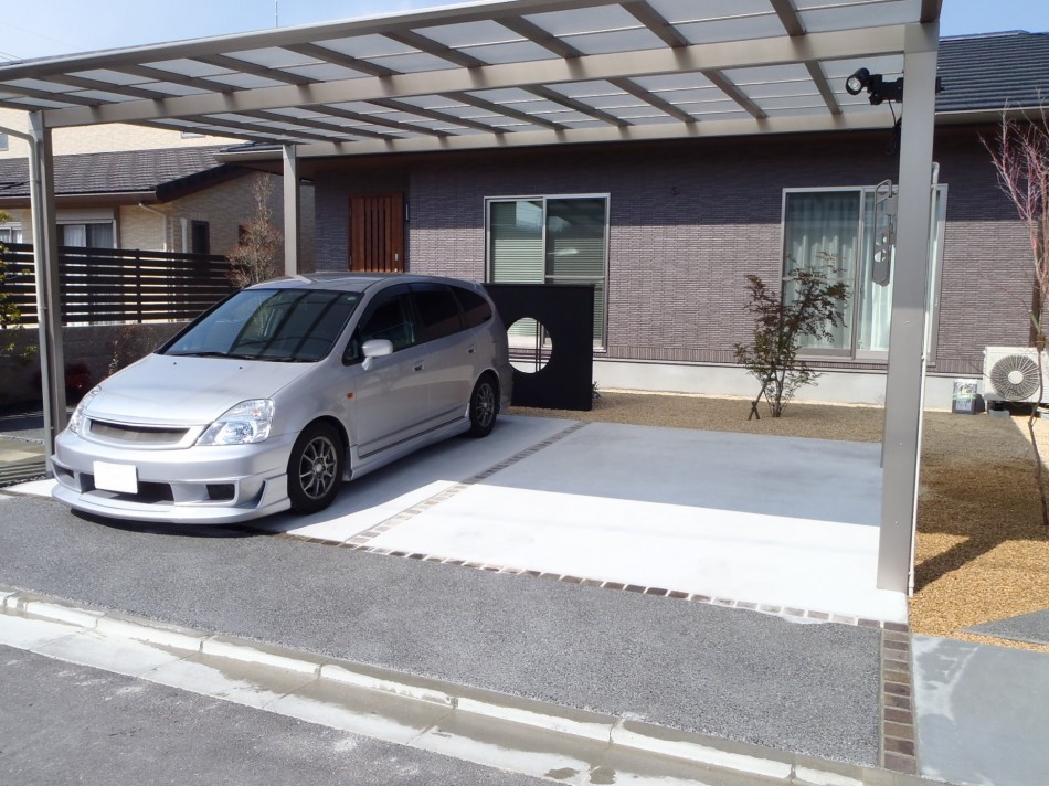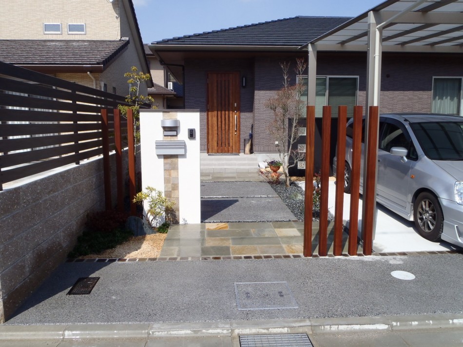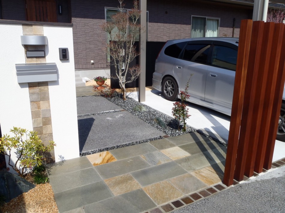 アプローチ モダン和風の落ち着いたエクステリア 大きなカーポートと視界をあまろ遮らない目隠しで、プライベート空間を仕切りつつ開放感のある空間になりました。庭石と植栽で落ち着いた季節の感じられる庭が目を楽しませてくれます。 アプローチ, トータルデザイン, 和の庭, 車庫廻り, 門廻り リフォームに合わせたリガーデン 優しい配色のナチュラルスタイル