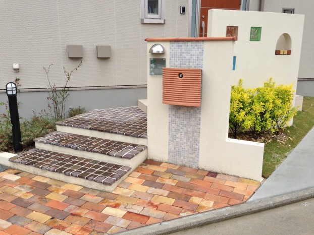 アプローチ 優しい配色のナチュラルスタイル 全体的に優しい配色で統一感のある仕上がりになりました。階段は耐火レンガ・ポルフィードのこだわりの石畳です。 アプローチ, トータルデザイン, 門廻り モダン和風の落ち着いたエクステリア