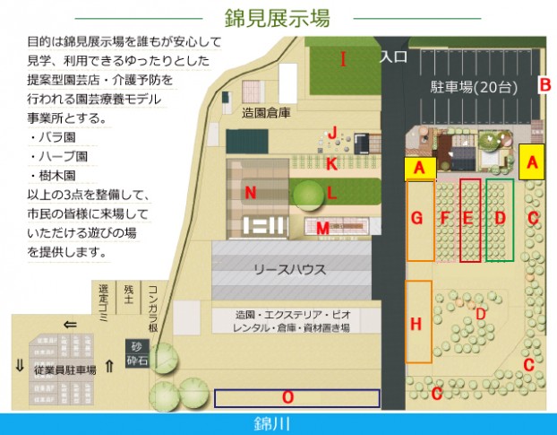 錦川沿いに広がる緑の広場、錦見展示場。1,700坪(6,000㎡)の広大な敷地には、大量の和風・洋風の庭木・植物を取り揃えています。また、レンガや石材、おしゃれなジャリ、カントリー調の雑貨やテラコッタ等、園芸資材もいっぱい!見て、触って、あなたのお気に入りを探してください。また、お庭について、気軽にご相談ください。豊富な展示資材を見ながら、夢のお庭について語りましょう。